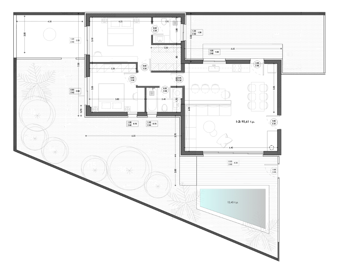 It features two bedrooms (including one Master suite), two bathrooms, and a spacious open-plan area hosting the living, dining, and kitchen spaces. The architectural design dissolves the boundaries between indoors and outdoors, allowing the living area to flow harmoniously as a seamless extension into the private garden.